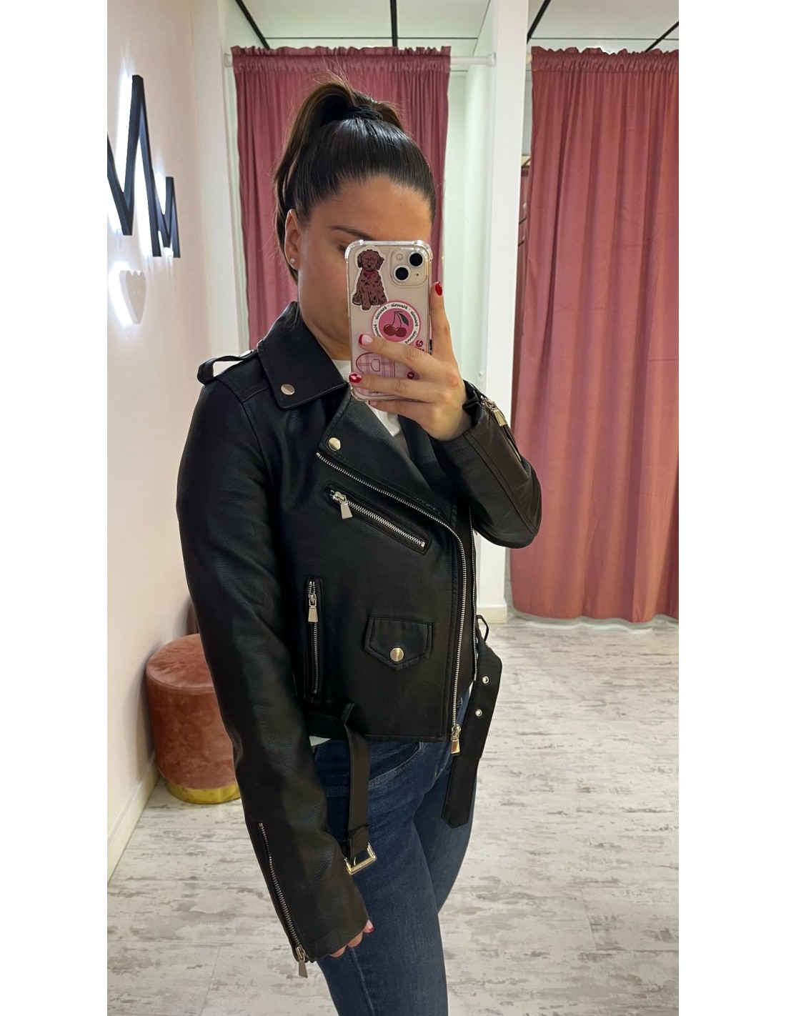Cazadora de piel en color negro con los detalles en color plateado, forrada en su interior. Una prenda básica y estilosa.