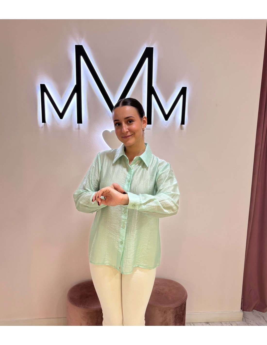 Espectacular camisa en color verde, con efecto transparencia, abotonada.