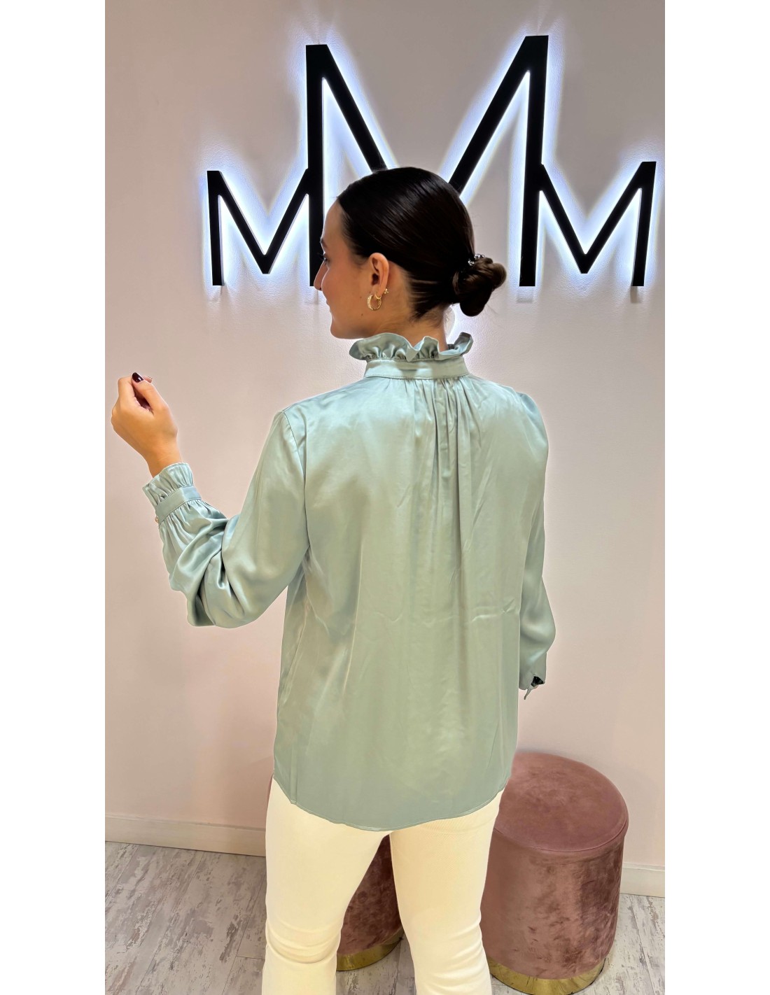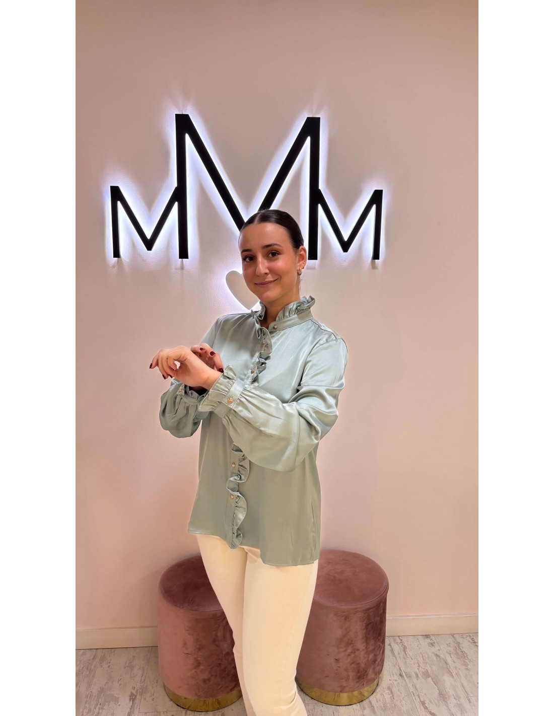 Espectacular camisa de tejido satén en color verde mint, con detalle de volante en el puño y cuello, y botonadura dorada