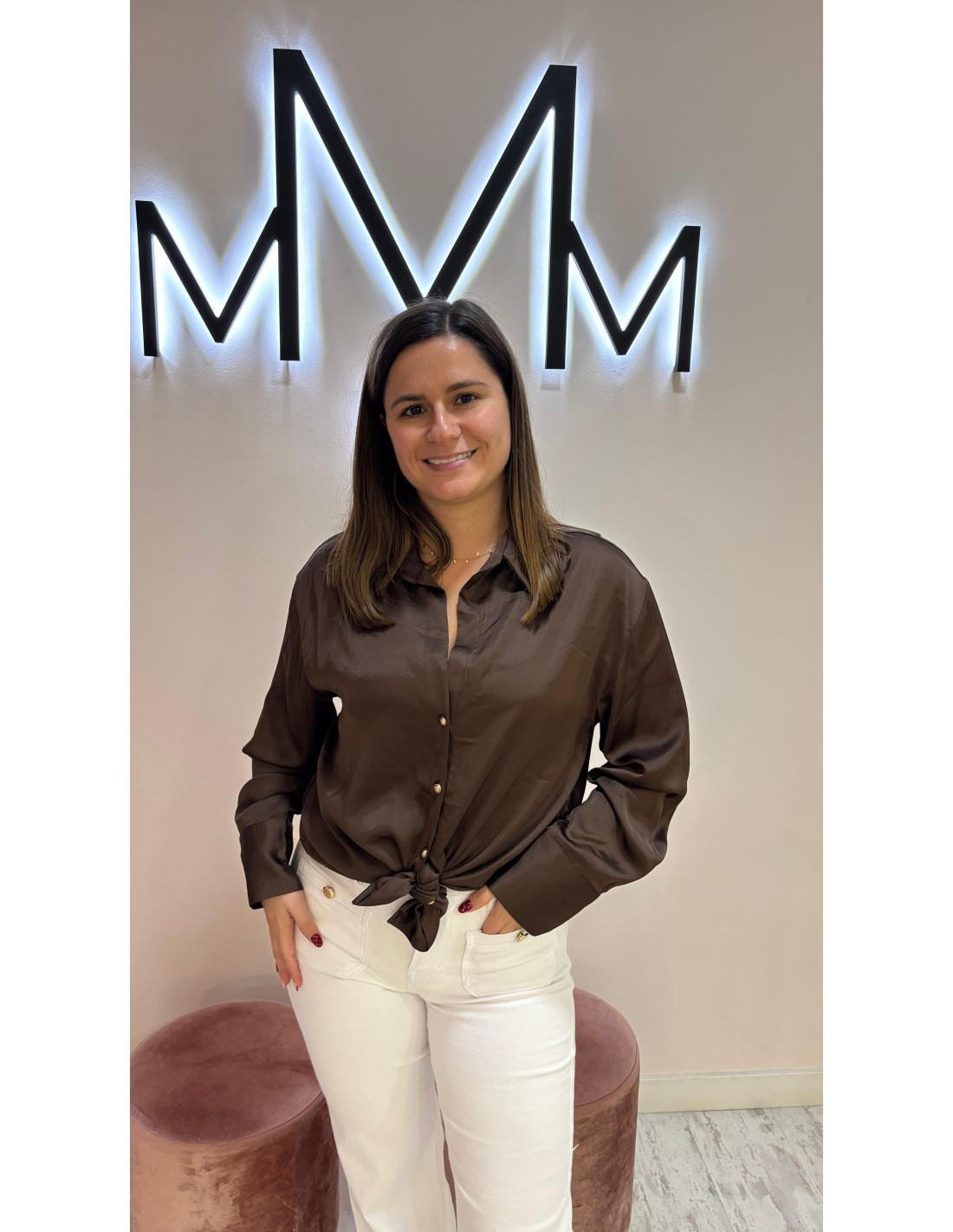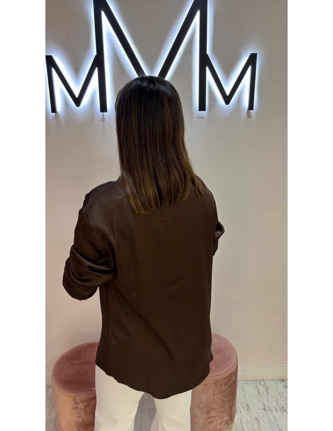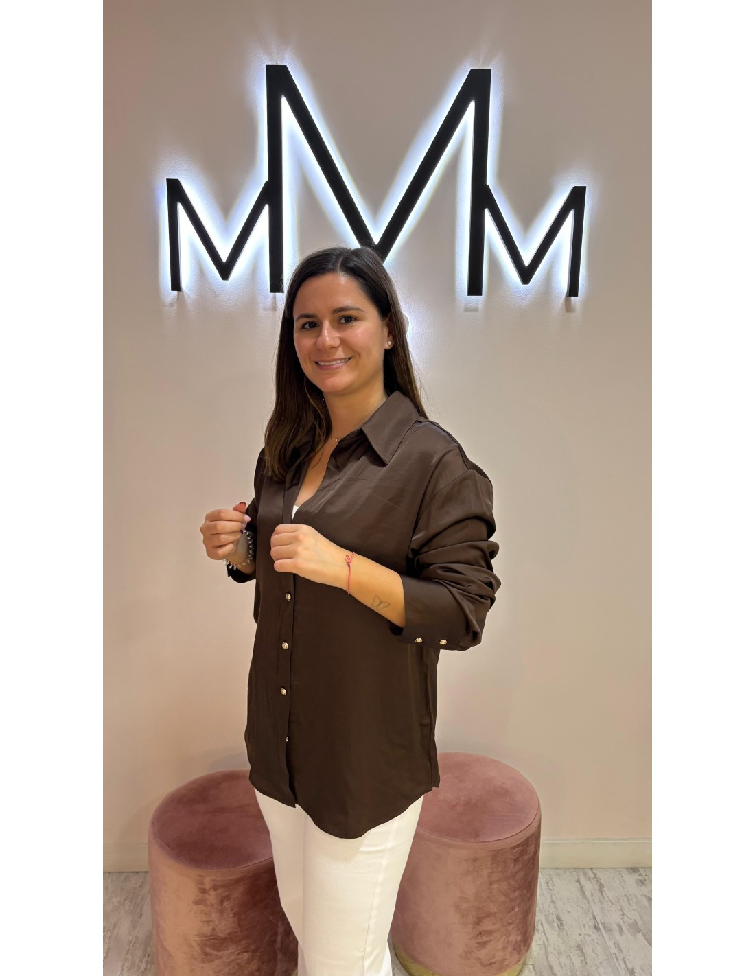 Preciosa camisa satinada en color marrón chocolate estilo oversize, con el detalle de escote en pico y botonadura dorada