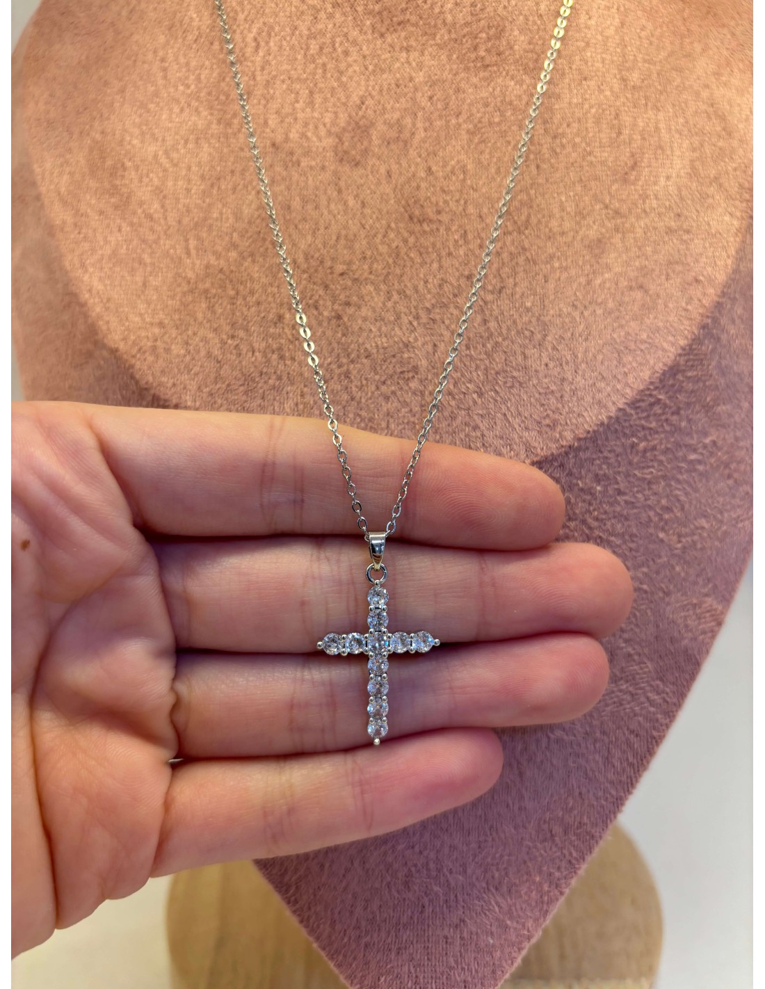 Collar de acero inoxidable en color plateado en forma de cruz, combinado con brillantitos.
