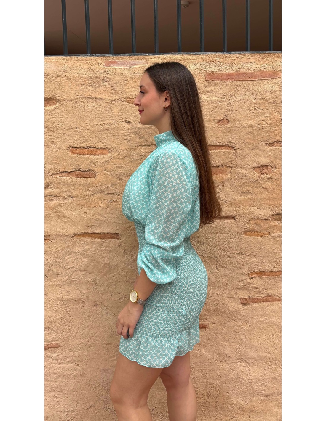Increíble vestido corto de color verde mint con escote en pico estilo cuello halter, manga larga de seda y falda de panel engomado con volate.