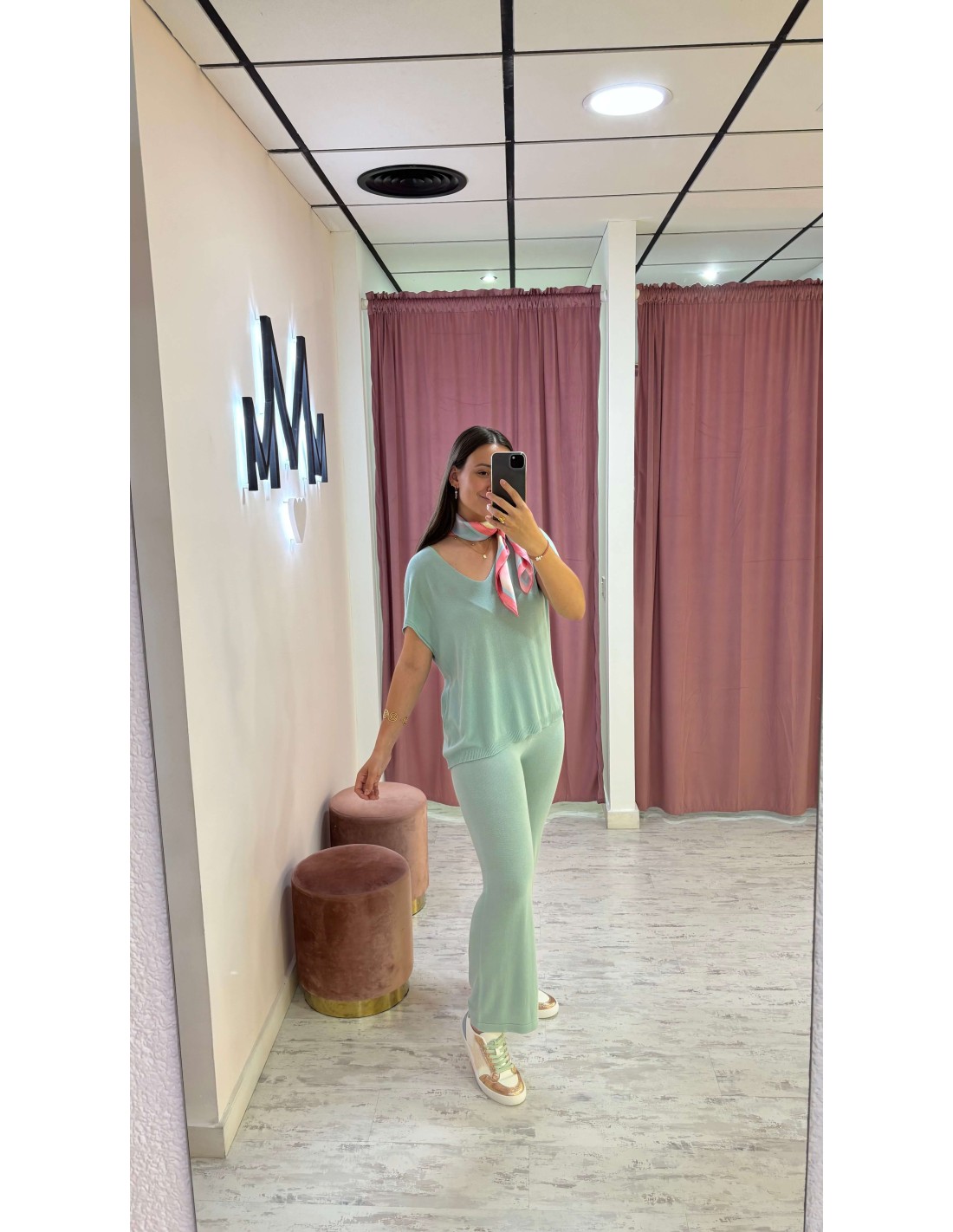 Pantalón ideal de punto fino en color verde mint, estilo flare acampanado con goma enl a cintura.