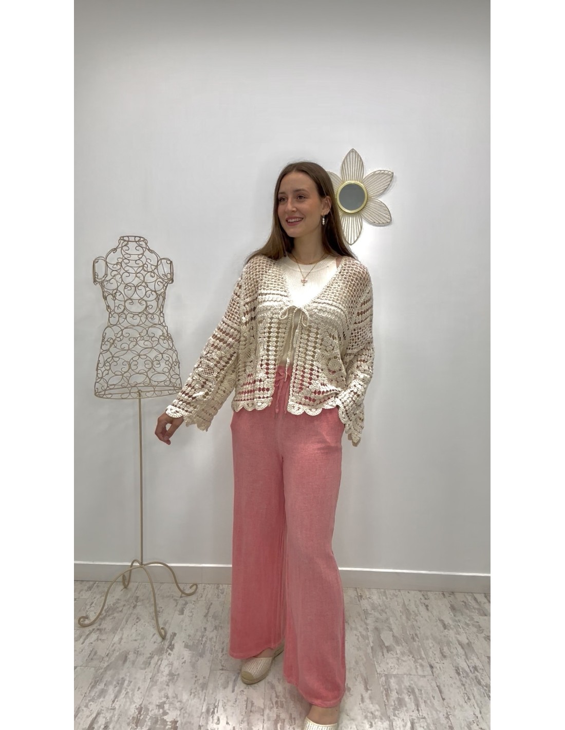 Estiloso y cómodo pantalón de lino en color coral. Corte recto con goma y lazada en la cintura regulable.