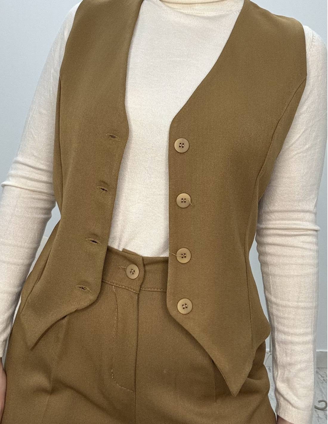Talla unica. Color camel.Talla desde una 32 a 38. Altura de la modelo 1,68.