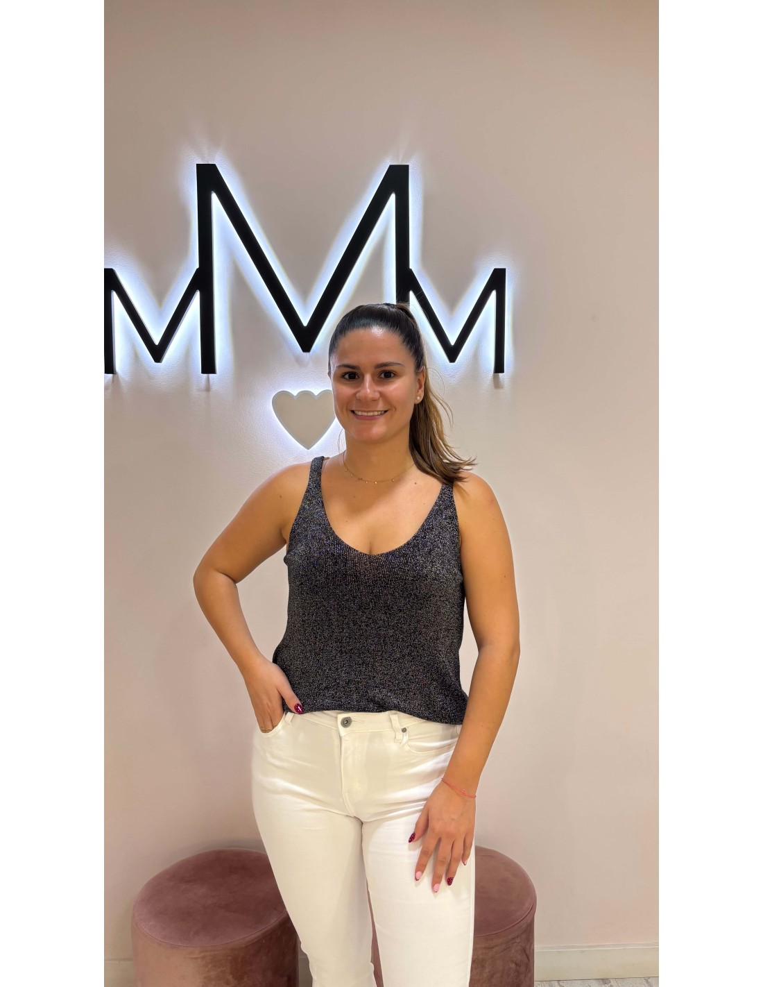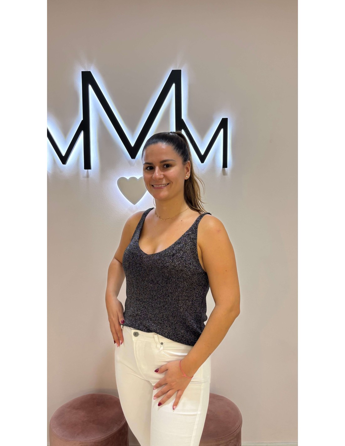 Precioso top de hilo en color negro con detalle de brillo lúrex, de tirantes y escote en pico tanto delantero como en la espalda