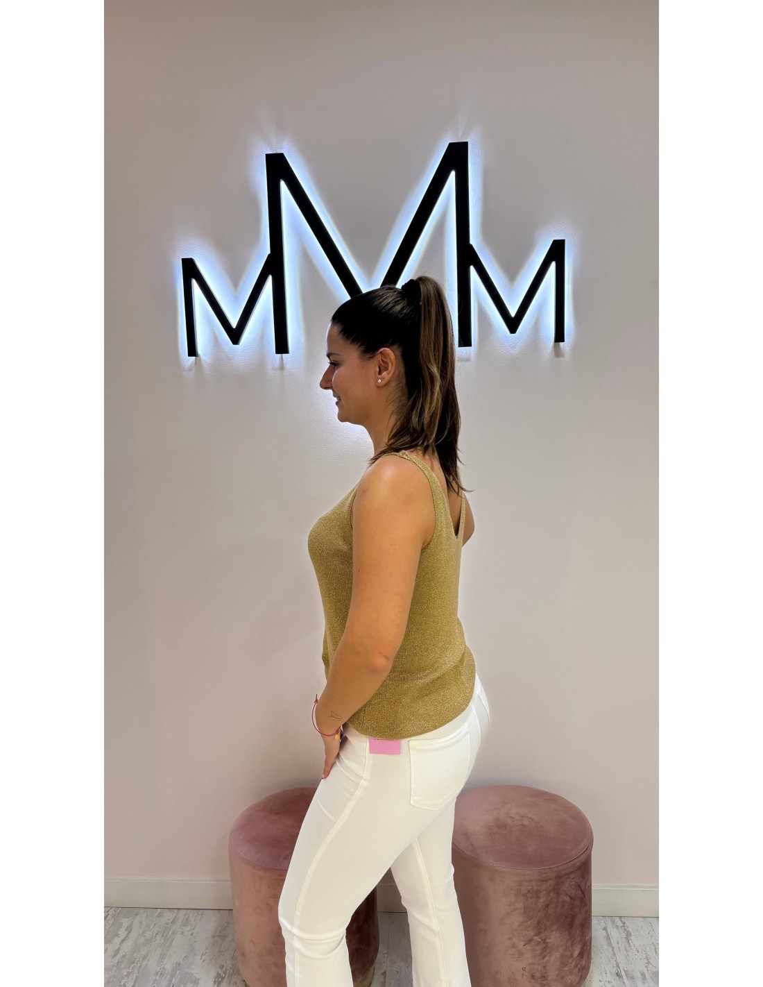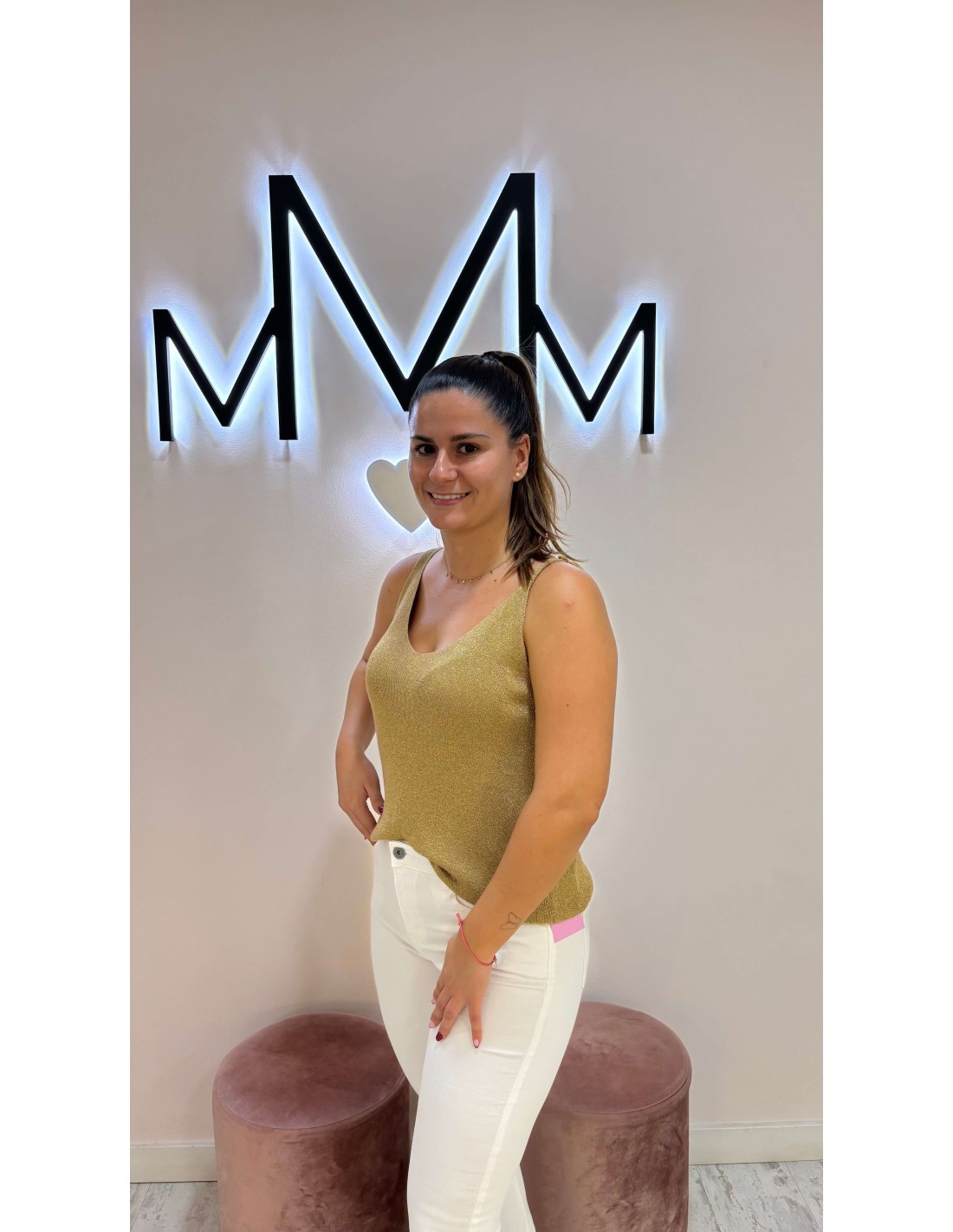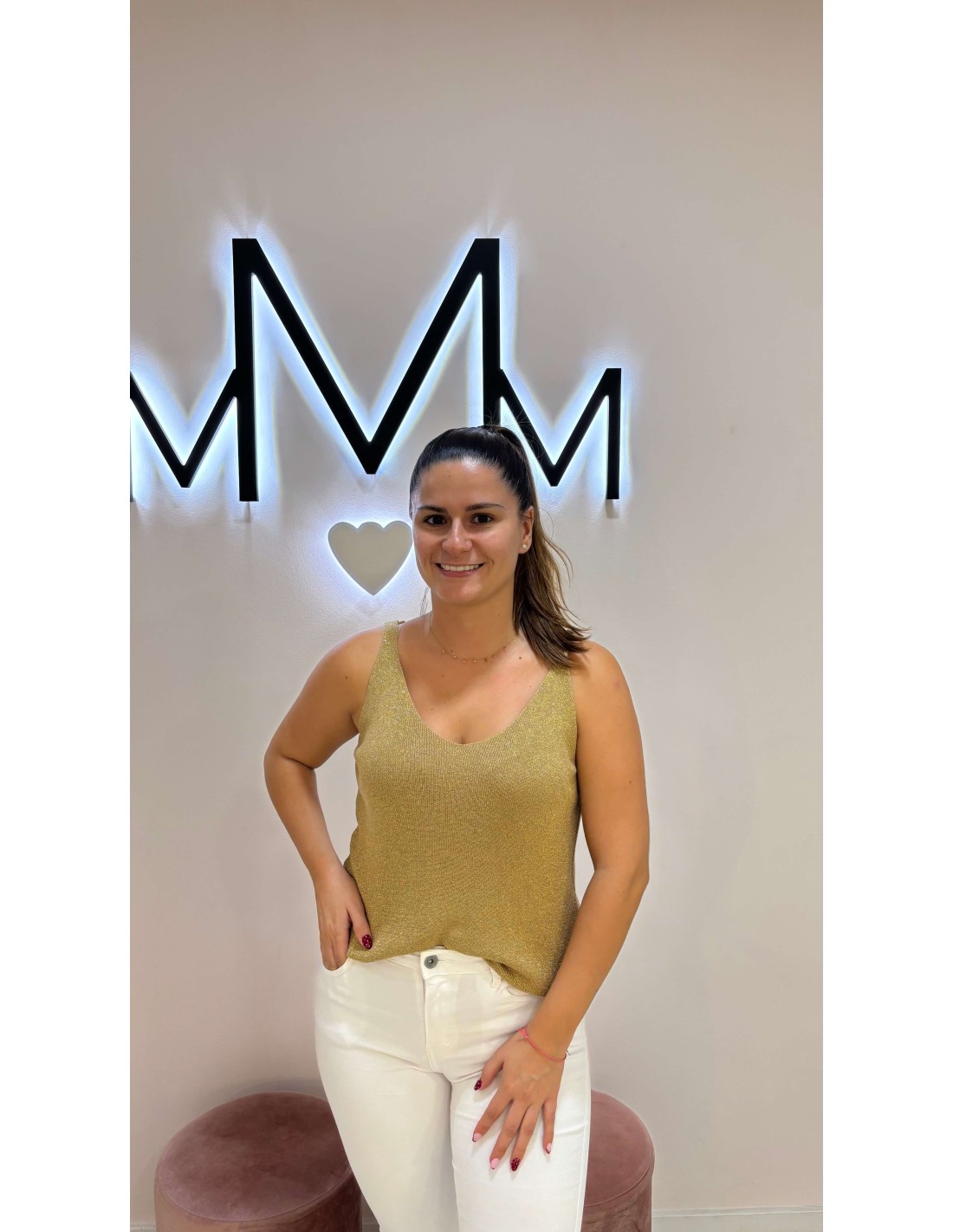 Precioso top de hilo en color camel con detalle de brillo lúrex, de tirantes y escote en pico tanto delantero como en la espalda
