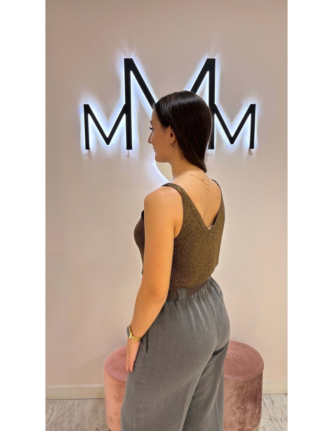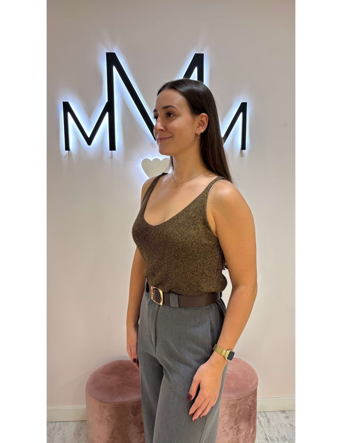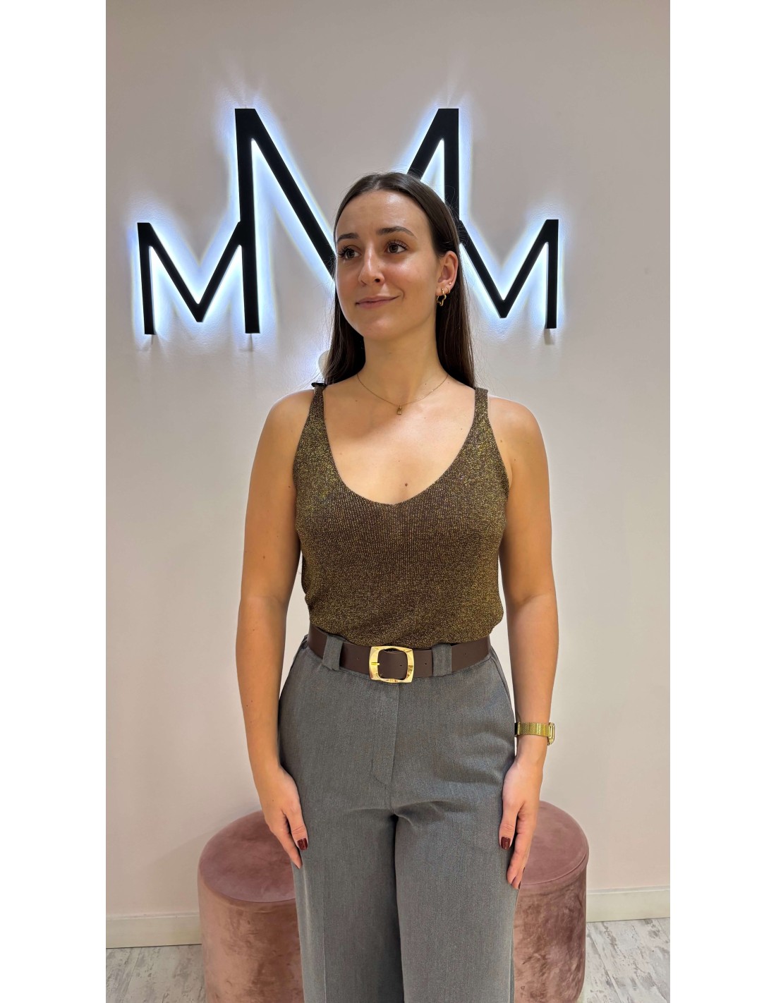 Precioso top de hilo en color chocolate con detalle de brillo lúrex, de tirantes y escote en pico tanto delantero como en la espalda