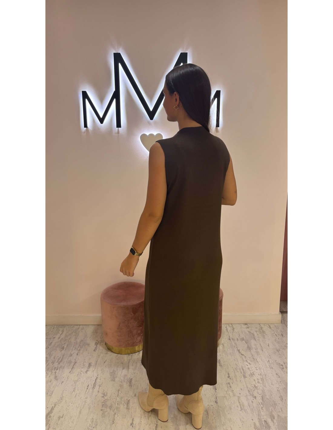 Vestido largo de punto en color chocolate, con caída recta, sin mangas, cuello mao y detalle de discretas aperturas (en espalda o pecho) dos posiciones.