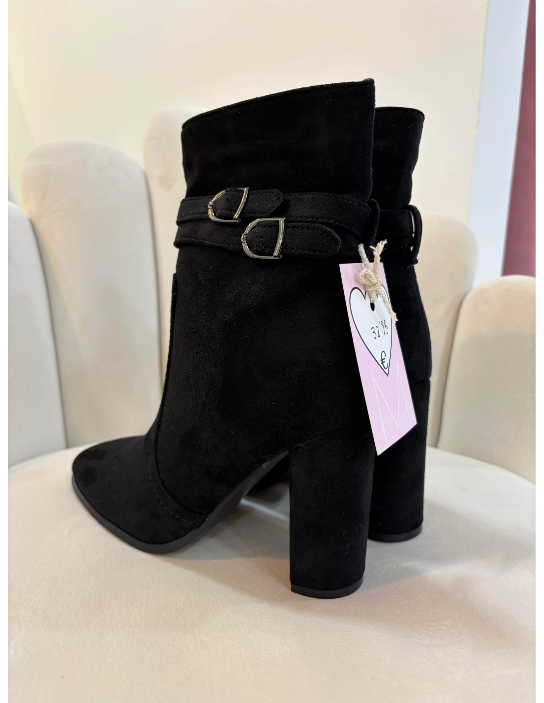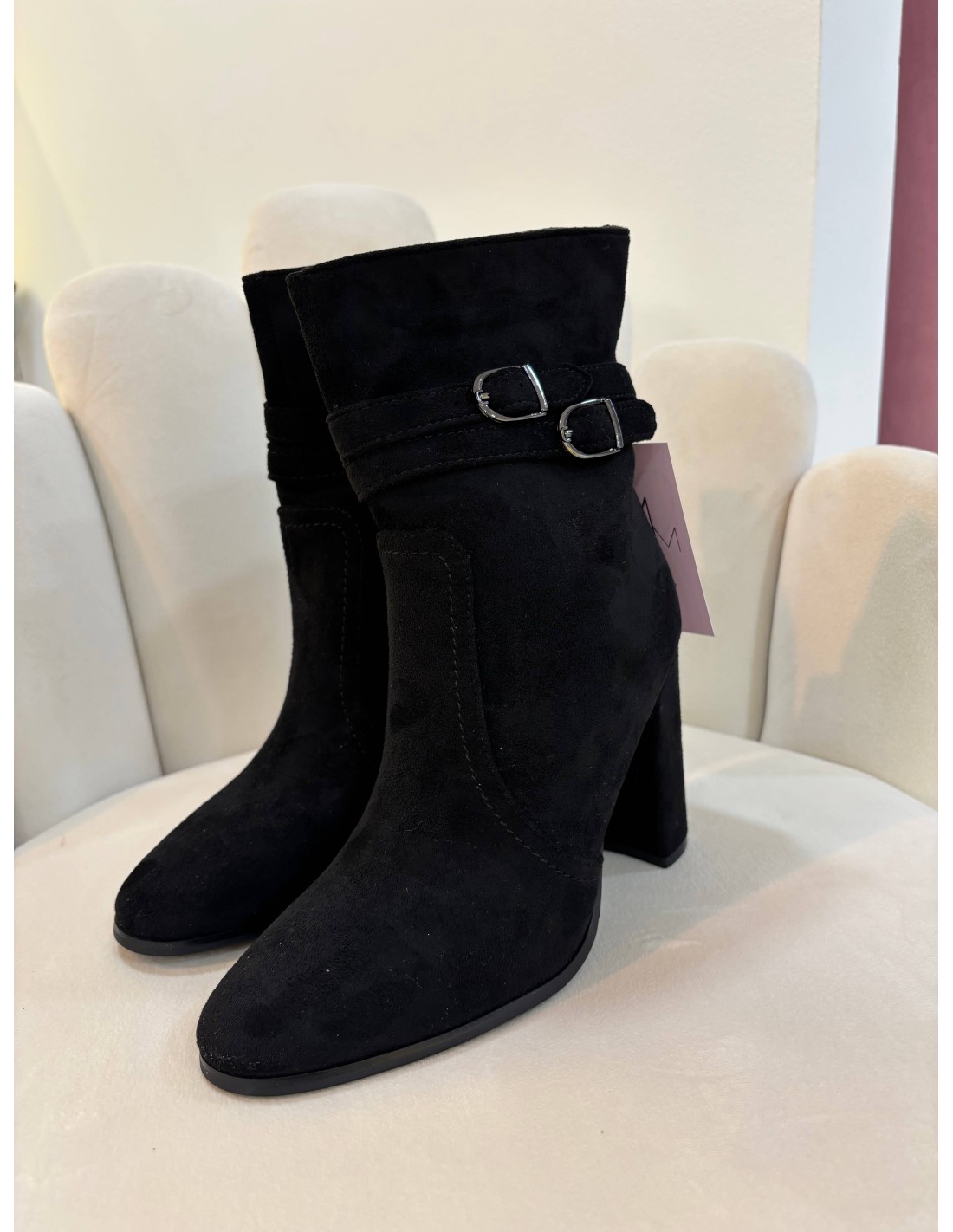 Elegante botín negro de punta redonda, tejido ante con hebillas laterales para estilizar.